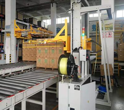 水平棧板打包機(jī)實現(xiàn)托盤產(chǎn)品水平自動打包.